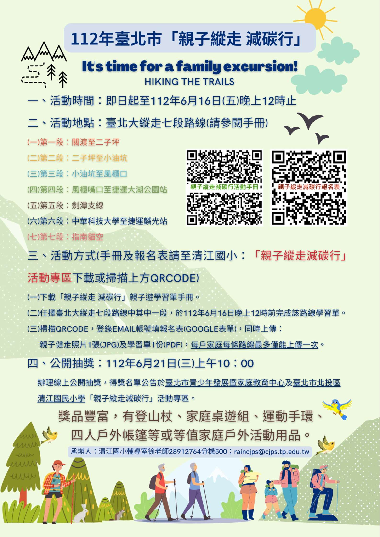 一、本活動訂於112年6月21日(星期三)上午10時辦理線上公 開抽獎,得獎名單公告於臺北市青少年發展暨家庭教育中 心網站及臺北市北投區清江國民小學「親子縱走減碳行」 活動專區。倘有疑義,請洽臺北市北投區清江國民小學輔 導室徐老師,電話:02-28912764轉500;Email: raincjps@cjps.tp.edu.tw。
