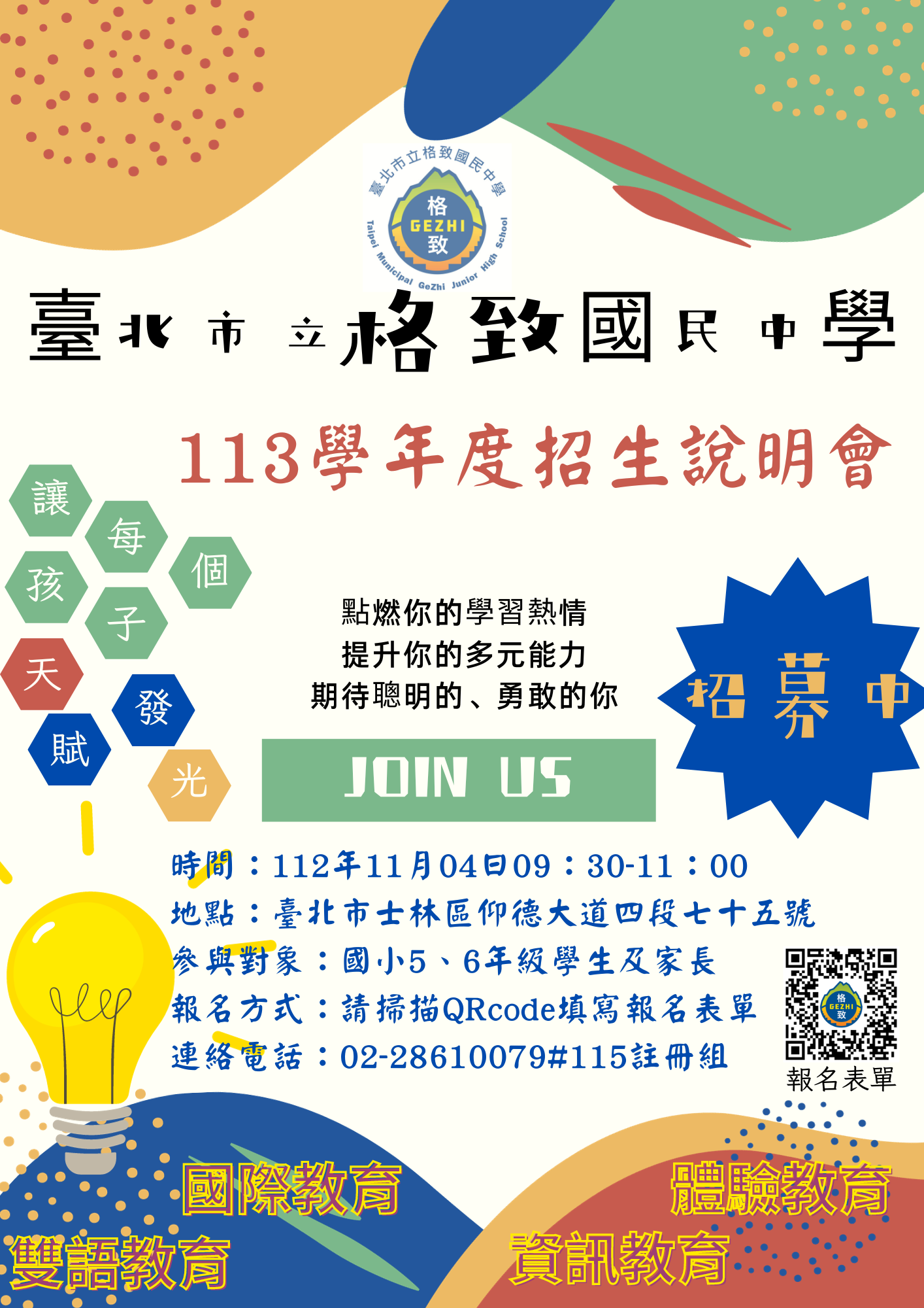 報名方式:敬請有意參加招生說明會之學生及家長,於112年11月2日(星期四)前登錄Google表單(https://reurl.cc/y6mvda)完成報名。