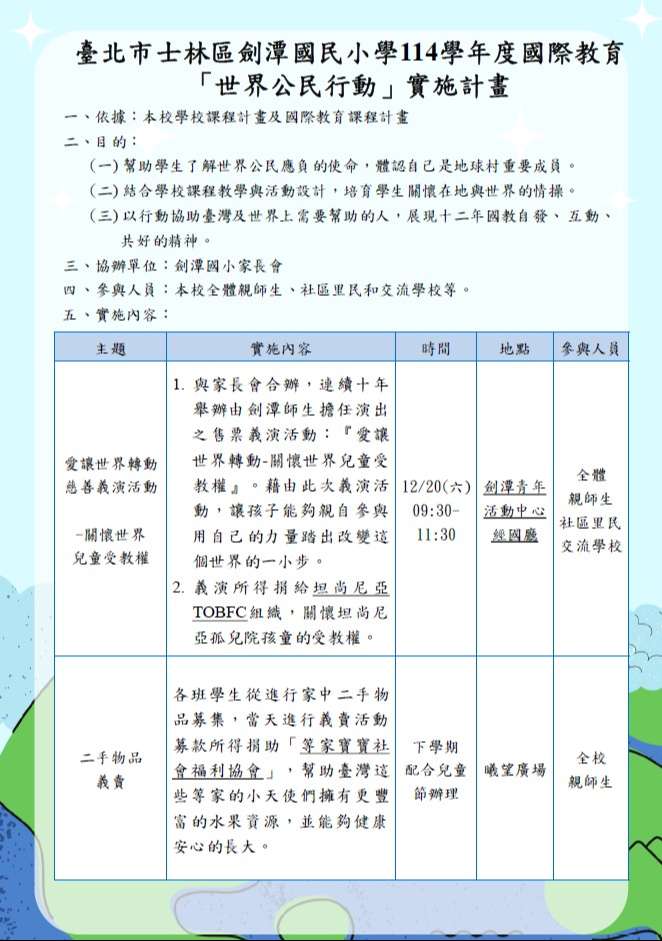 目的:本活動與家長會合辦,由劍潭師生擔任演出,藉由孩子的行動,用自己的力量改變這個世界。